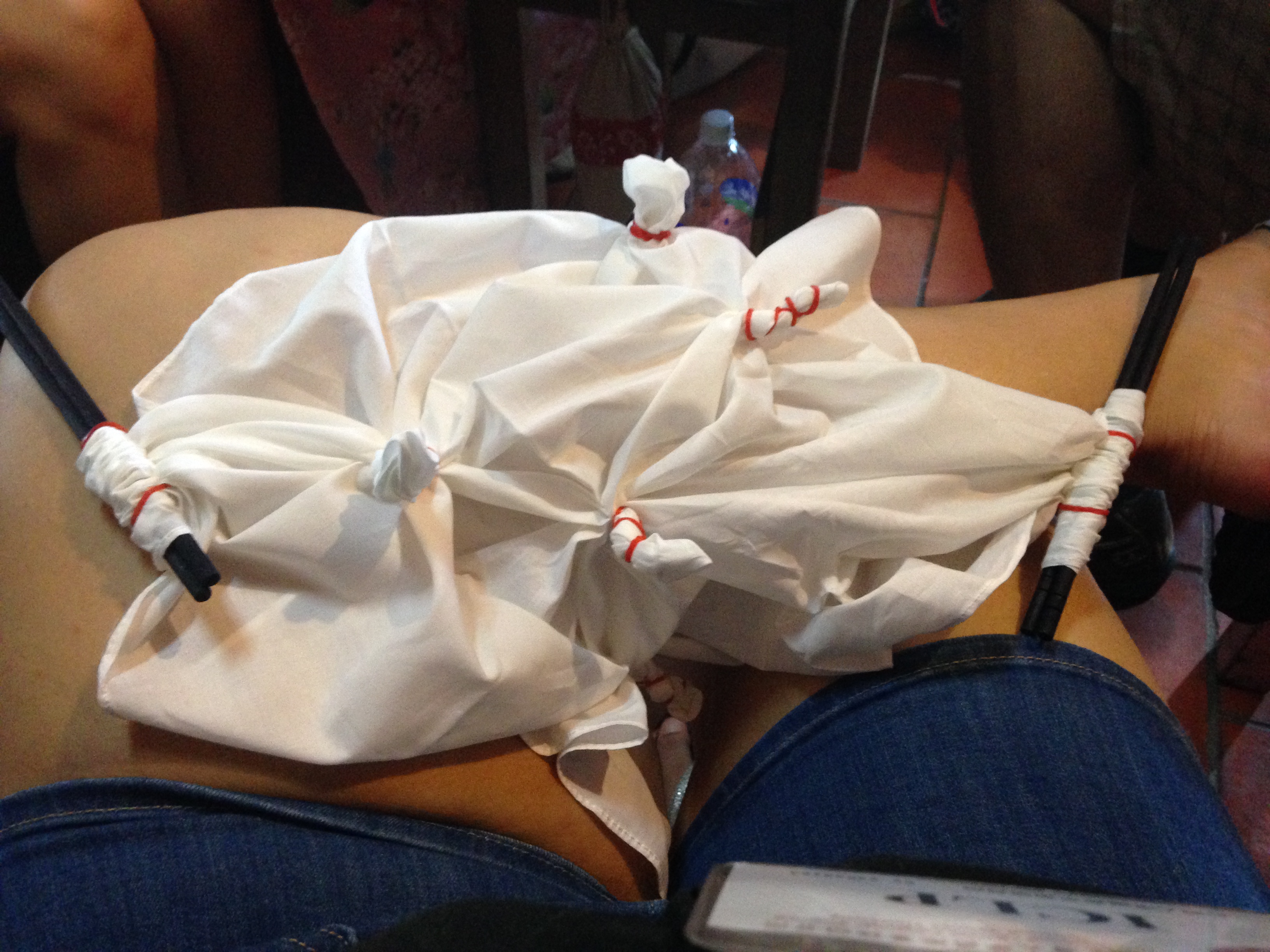Prep my cloth for the dying process — I was told the little chopsticks at the ends would make a ripple effect, and the tightly balled circles would make…well circles.