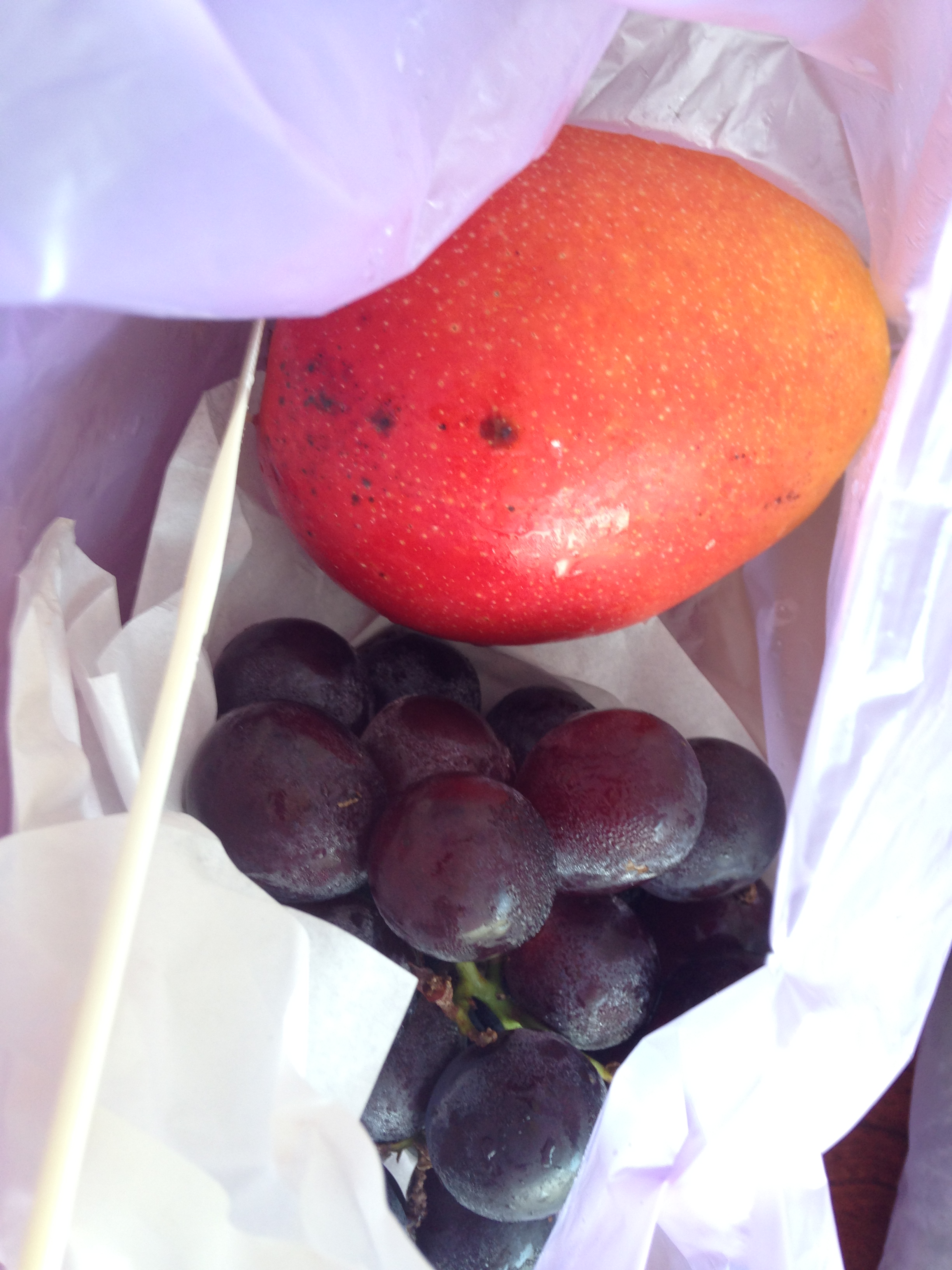 Fresh fruit — mango (no mango I’ve seen in America is ever this red!) and my favorite type of grapes…